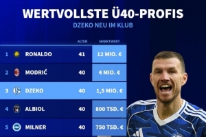 现役年龄40岁及以上球员身价排行:C罗1200万欧最高 魔笛哲科二三