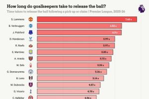 英超各队门将平均拿球/扑救后球出手时间: