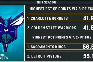 三分命中数占比:黄蜂41.9%第一,勇士41.8%第二