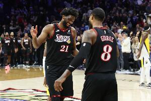 本场乔治解禁复出,他出战26分钟,投篮22中11,三分13中6,砍下28分6篮板4助攻4抢断1盖帽,正负值+14。