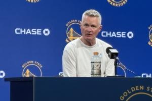 小吧参加了勇士的赛前新闻发布会,期间有记者谈到了近期的阿德巴约83分热门话题,他们问科尔曾经在克莱三节得到60分的情况下将他换下时的心态。