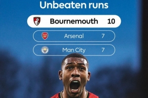 英超官方数据统计显示,伯恩茅斯的10场不败是目前英超最长,阿森纳和曼城都是7场不败。