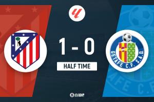 上半场补时2分钟,马竞1-0赫塔菲。
