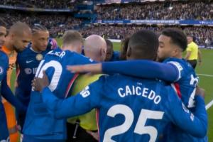 英超第30轮,切尔西vs纽卡,切尔西球员赛前围圈把主裁保罗·蒂尔尼围住,帕尔默抱裁判+盯着看。